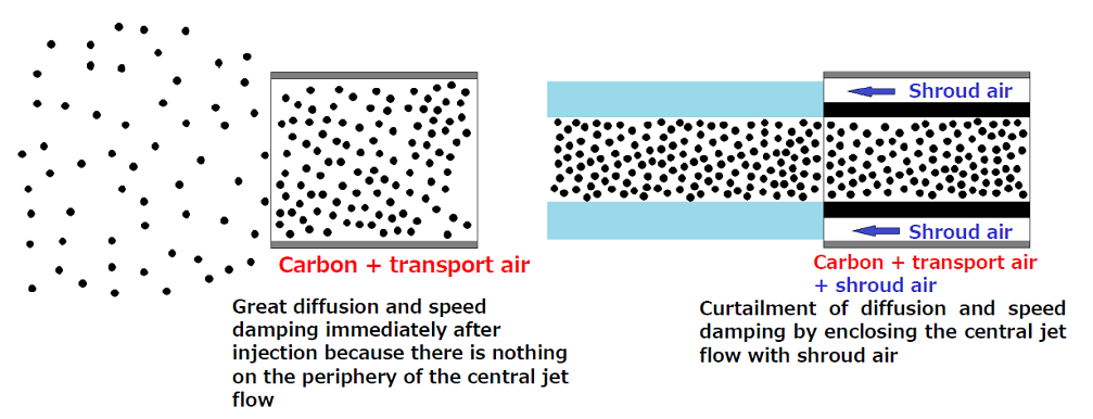 Immediately after injection, however, the carbon decelerates and diffuses, causing dust collection loss and a decline in the efficiency of carbon use. To address these issues, the TSCi has two types of air blowers: a nozzle for transporting carbon (transport nozzle) and a ring-type nozzle to curtail the damping of speed (shroud). This suppresses the deceleration and diffusion of the carbon blown out with an initial speed of Mach 2, and achieves a highly efficient injection onto the molten steel. This technology demonstrates a high injection performance not only for CDQ coke, which is used in Japan and has comparatively large particles, but for biocoke, which has good prospects for widespread use going forward for attainment of carbon neutrality (CN).