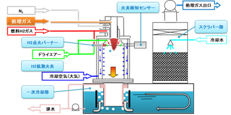 Ⓡ」の技術を組み合わせ、燃料源を従来の化石燃料からH2ガスへ適応させた排ガス処理装置です。